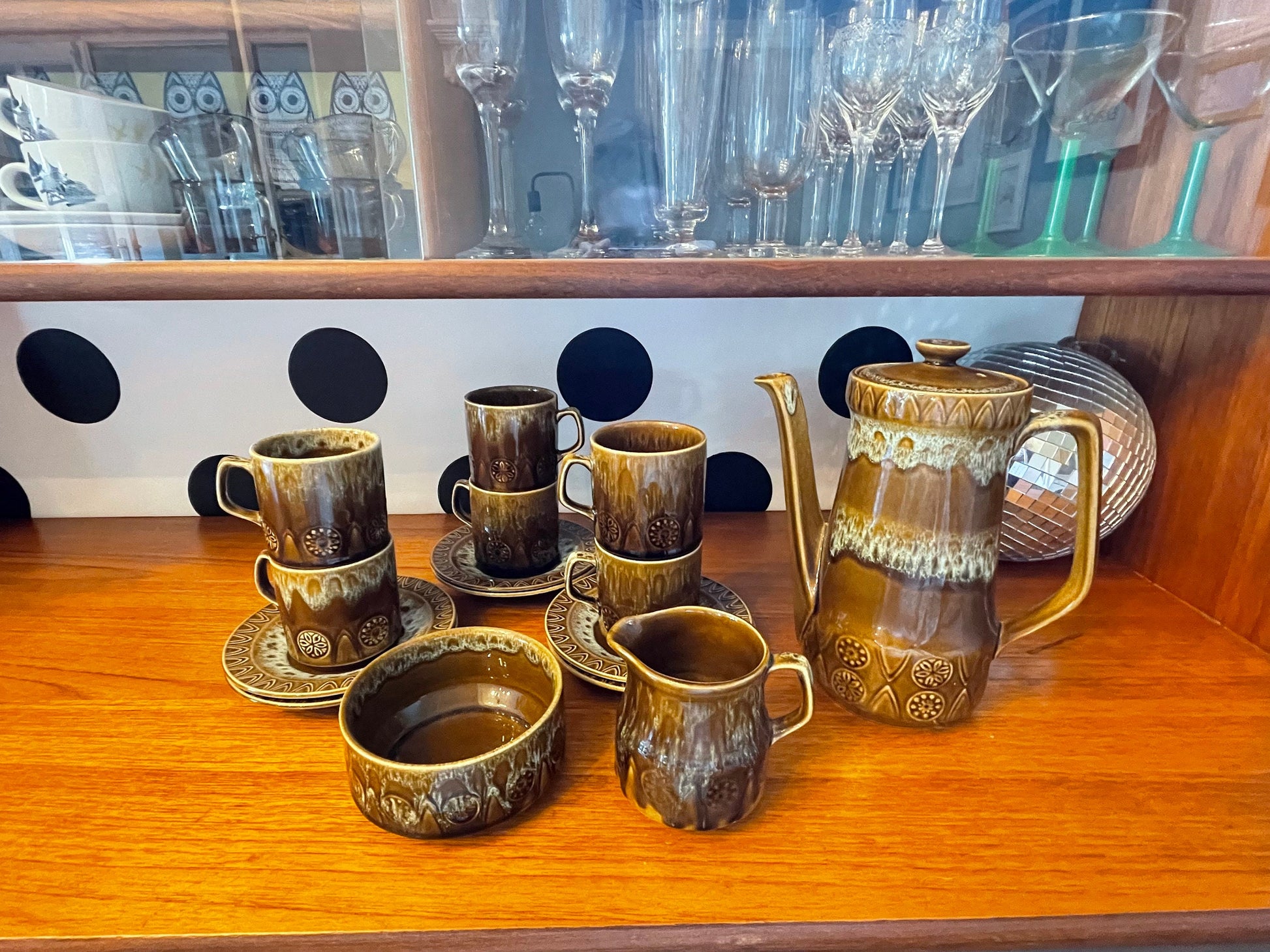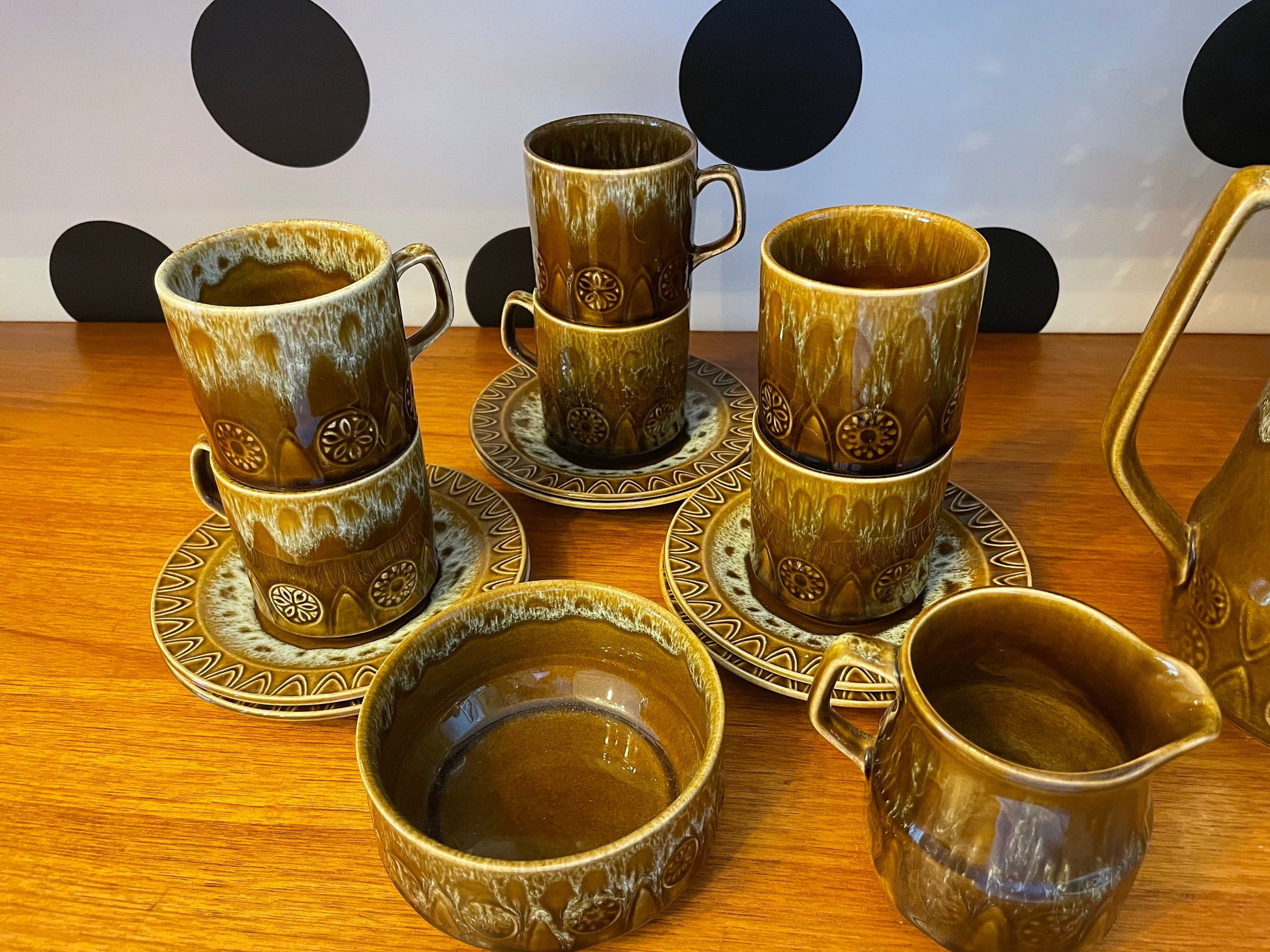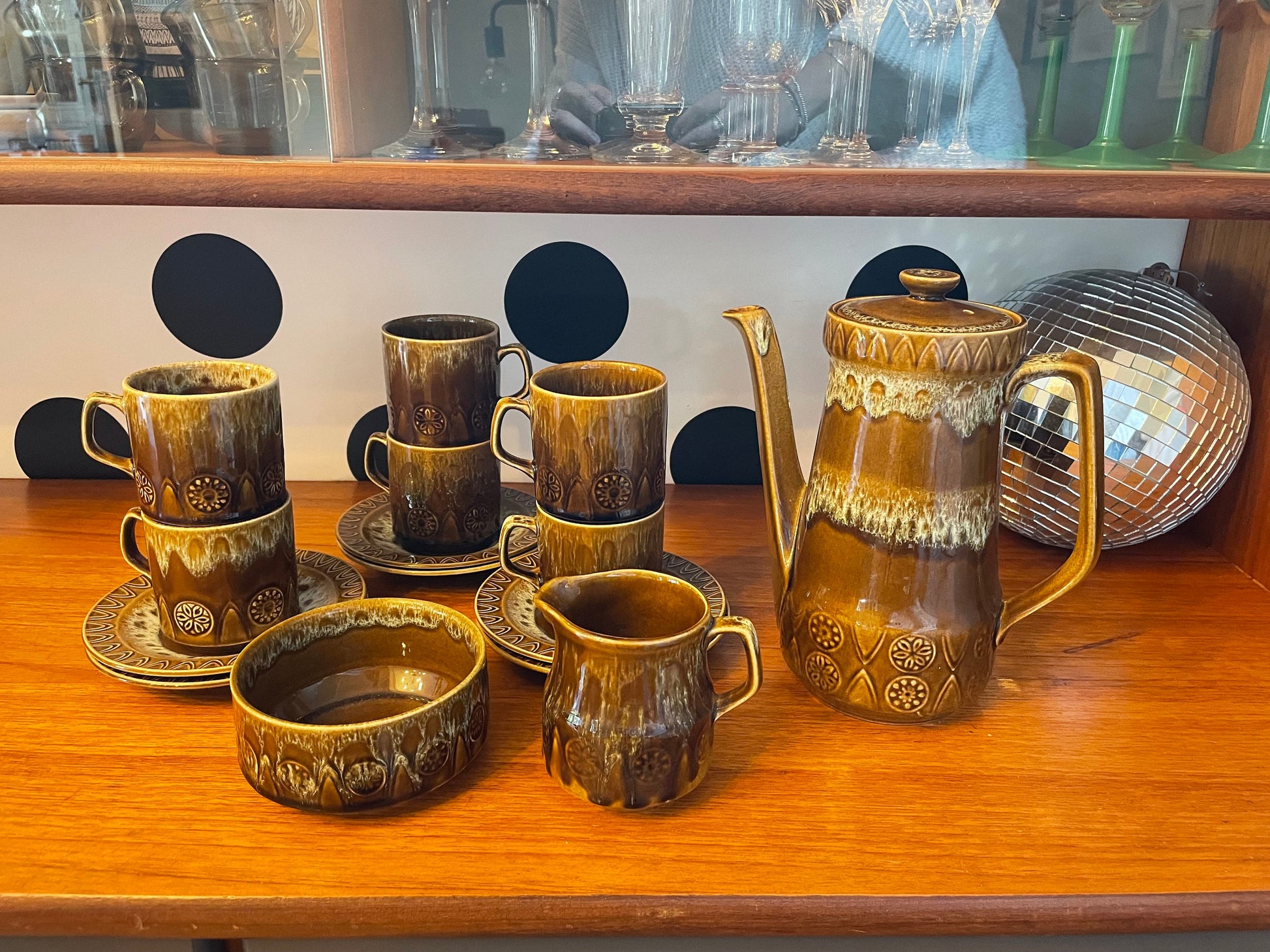 This matching set of six cups and saucers with coffee pot, sugar bowl and milk jug are handcrafted by Crown Ducal as part of the Concorde Astra range.