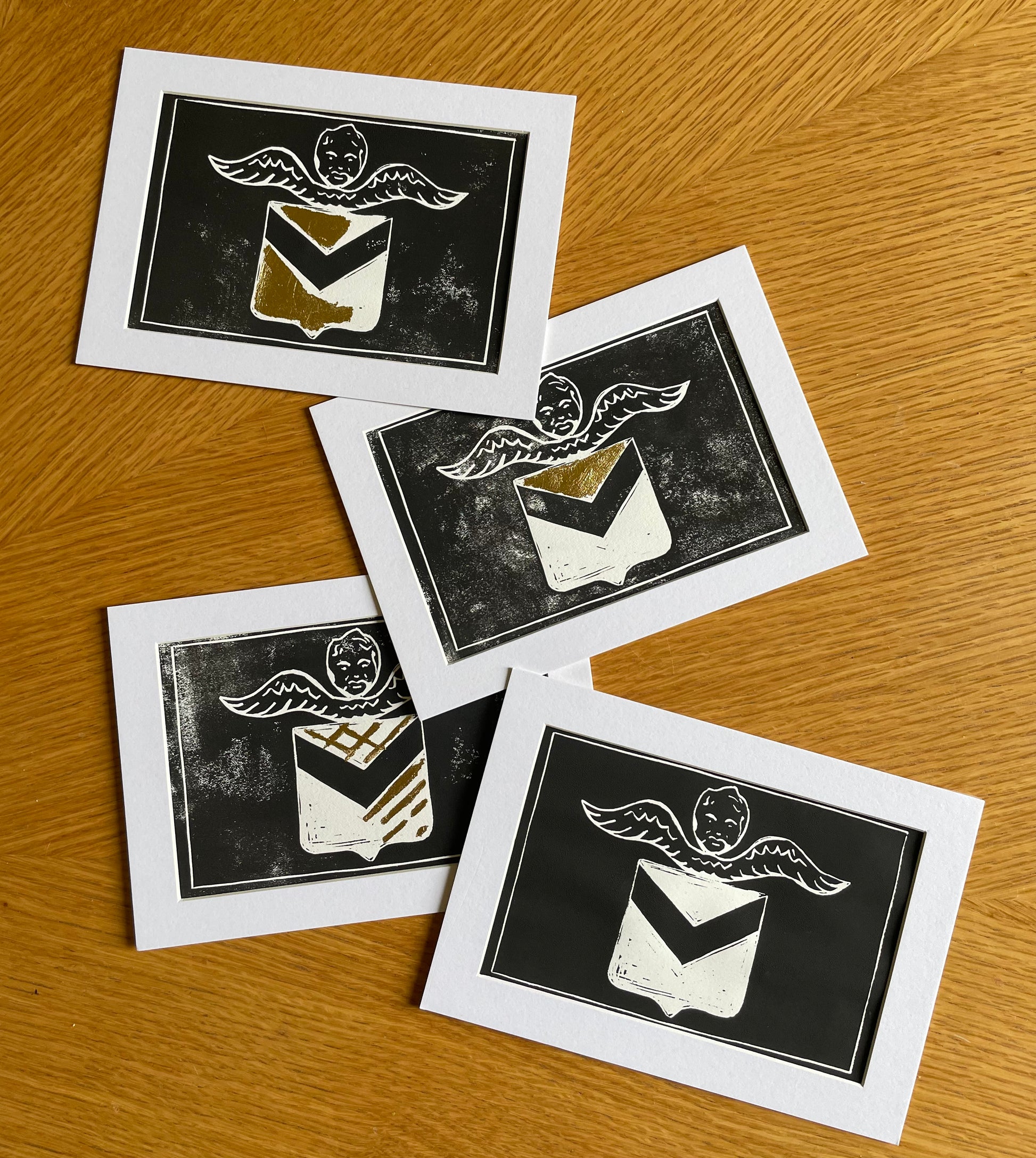 Handcrafted Original Lino Print of the Newport Cherub – Unique Art with Gold Leaf and Ink Detailing